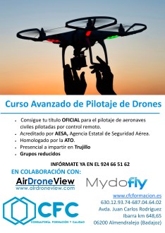 A partir del próximo 8 de mayo de 2017, se impartirá un curso oficial de piloto de drones en Trujillo (Cáceres). Este curso es el exigido por la Ley 18/2014, impartido por la ATO Mydofly E-ATO-0236. En este curso, Air Drone View participa en calidad de instructores de la ATO, uniendo así los conocimientos aeronáuticos de la ATO y los de una de las principales empresas de drones.